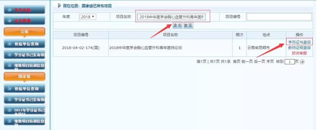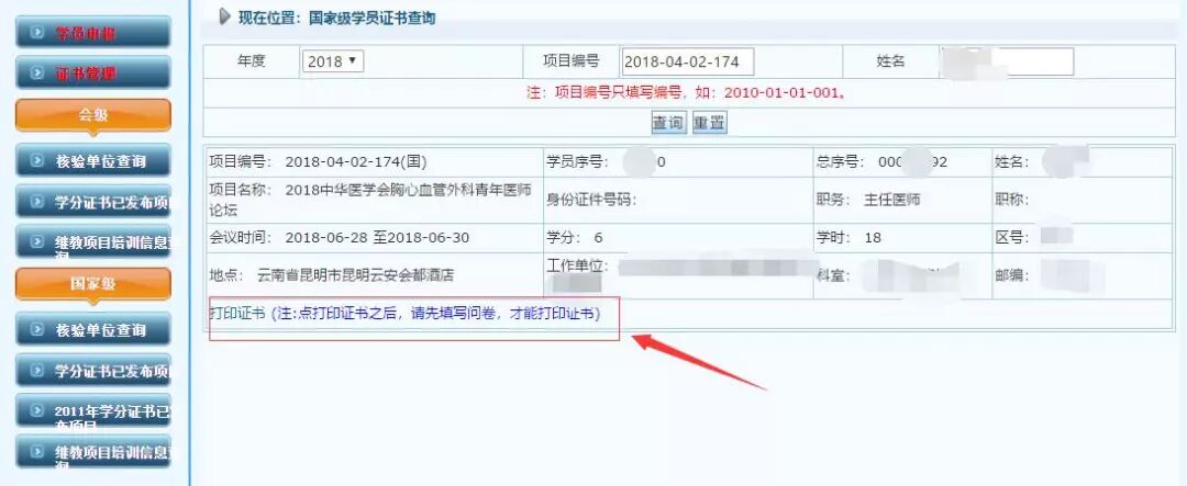 四、在项目名称框中输入“2018中华医学会胸心血管外科青年医师论坛”点击查询后,点击“学员证书查询”按钮