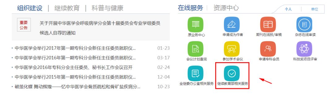 一、登录中华医学会网站(www.cma.org.cn) ,点击“在线服务”栏目下的继续教育相关服务。
